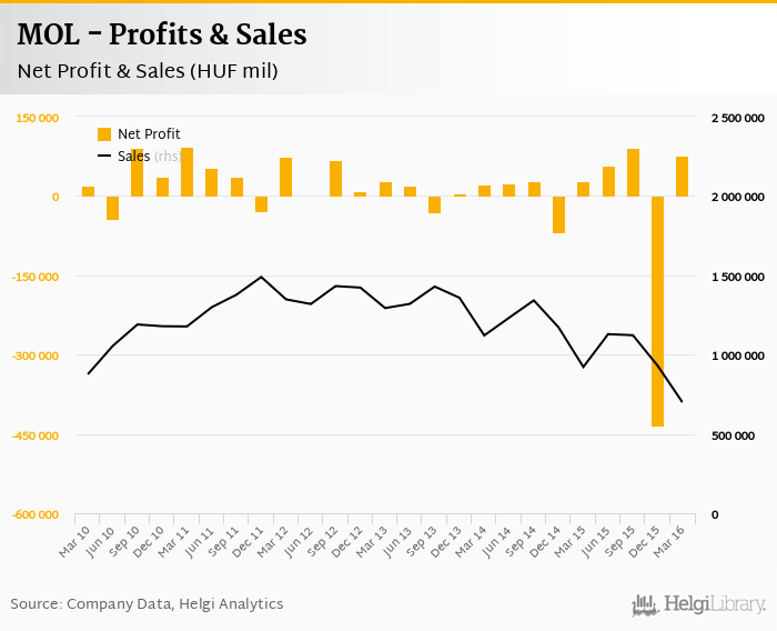 MOL made a net profit of HUF 77,177 mil in 1Q2016, up 165% compared to the previous year. Total sales reached HUF 699,362 mil, which is down 24.1% when compared to the previous year.