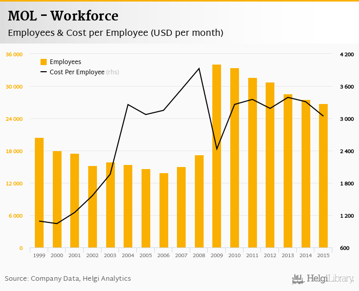 MOL employed 26,734 employees in 2015, down 2.71% compared to the previous year. Historically, between 1998 and 2015, the firm's workforce hit a high of 34,090 employees in 2009 and a low of 13,861 employees in 2006.