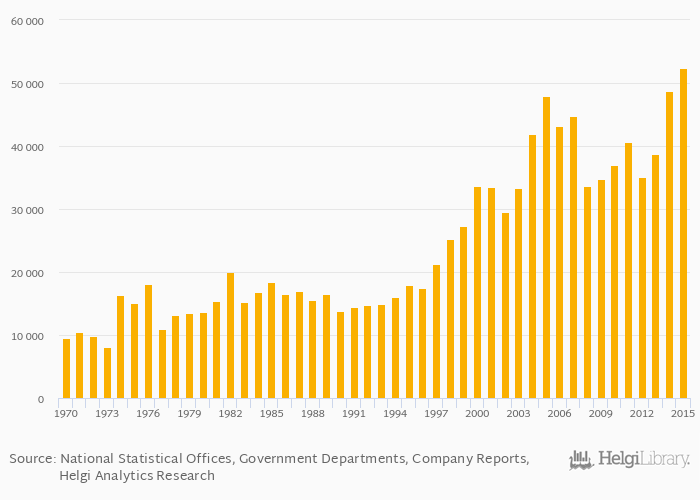 Historically, molybdenum (mine) production in Chile reached an all time high of 52,398 tonnes in 2015 and an all time low of 8,072 tonnes in 1973.