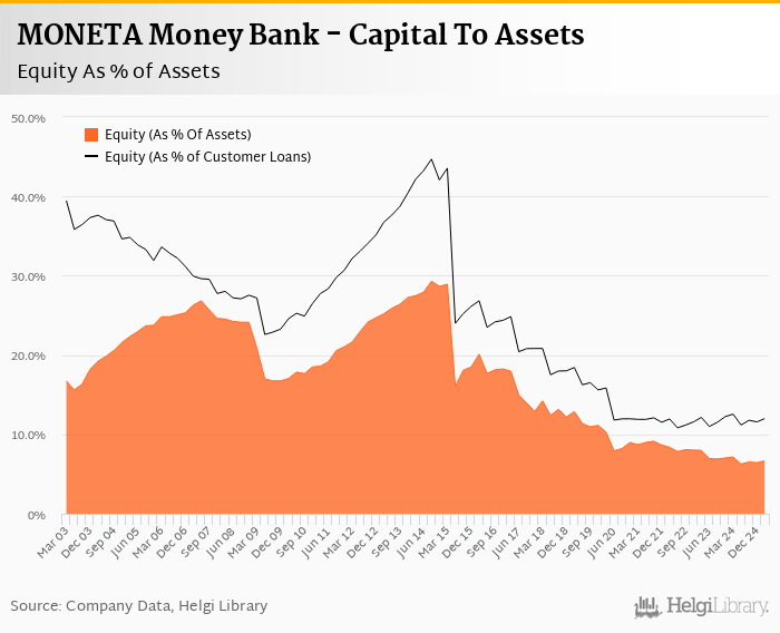 MONETA Money Bank's Equity reached 6.66% of total assets in the 1Q2025, down from 7.16% for the previous year. As a share of net customer loans, the ratio amounted to 12.0% at the end of the first quarter of 2025.