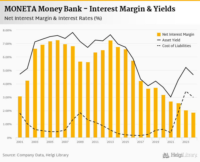 MONETA Money Bank's net interest margin amounted to 1.87% in 2024, down from 2.03% compared to the previous year.