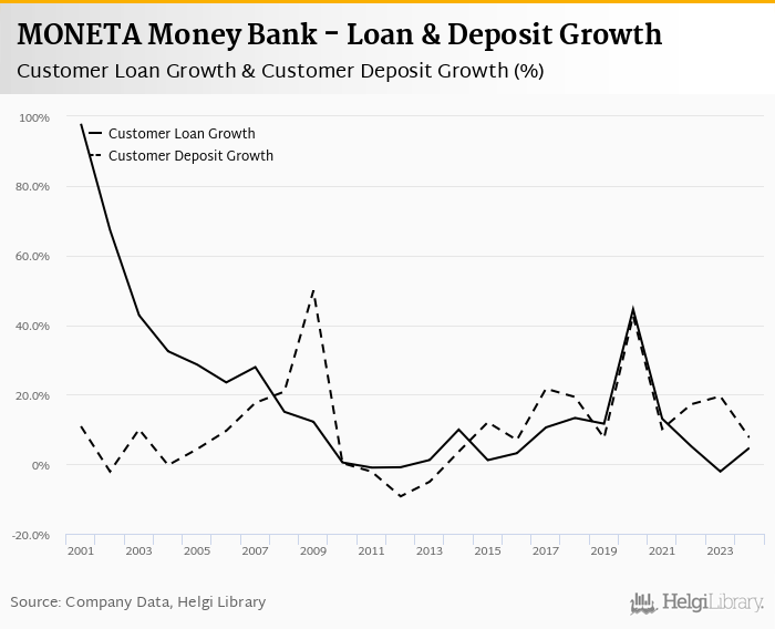 MONETA Money Bank's customer loan growth reached 4.68% in 2024, up from -2.12% compared to the previous year. Historically, the bank’s loans growth reached an all time high of 97.8% in 2001 and an all time low of -2.12% in 2023. In the last decade, the average annual loan growth amounted to 9.89%.