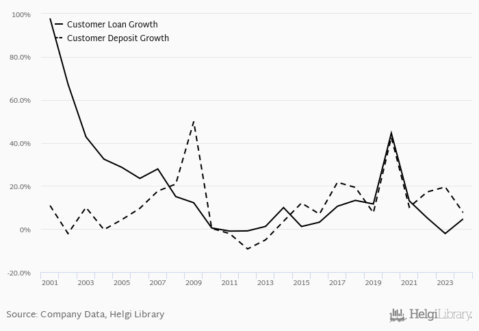 On the other hand, bank's customer deposit growth amounted to 7.64% at the end of 2024, down from 19.5% when compared to the previous year. Historically, the bank’s deposit growth reached an all time high of 49.9% in 2009 and an all time low of -9.25% in 2012. In the last decade, the average annual loan growth amounted to 16.1%.