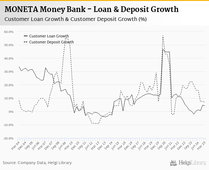 MONETA Money Bank's customer loan growth reached 4.13% in 2025-03-31, up from 0.270% compared to the previous year. Historically, the bank’s loans growth reached an all time high of 46.7% in 2020-06-30 and an all time low of -4.24% in 2013-12-31. In the last decade, the average annual loan growth amounted to 11.0%.