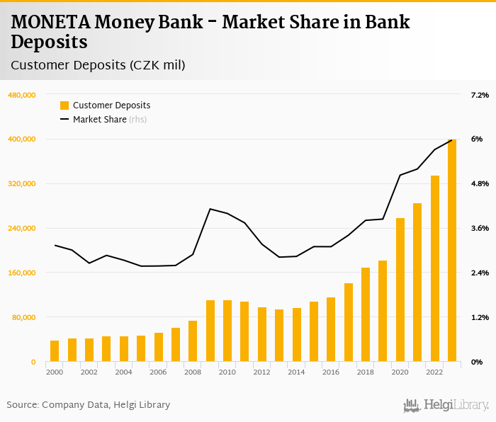 MONETA Money Bank's customer deposits reached CZK 399,497 mil in 2023, up 19.5% compared to the previous year.