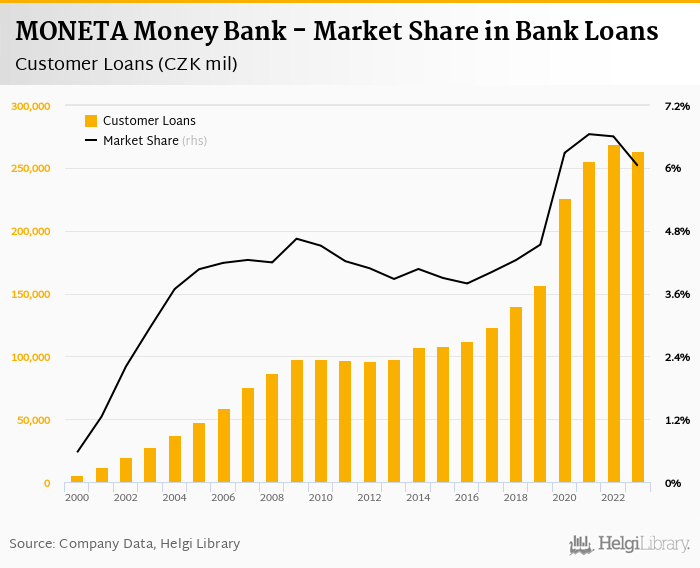MONETA Money Bank accounted for 6.04% of all customer loans issued in Czechia at the end of 2023. Historically, the bank’s market share in customer loans reached an all time high of 6.64% in 2021 and an all time low of 0.566% in 2000.