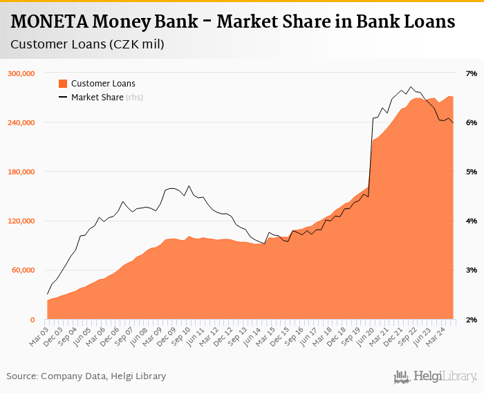 MONETA Money Bank accounted for 5.98% of all customer loans issued in Czechia at the end of 2024-09-30. Historically, the bank’s market share in customer loans reached an all time high of 6.72% in 2022-06-30 and an all time low of 2.50% in 2003-03-31.