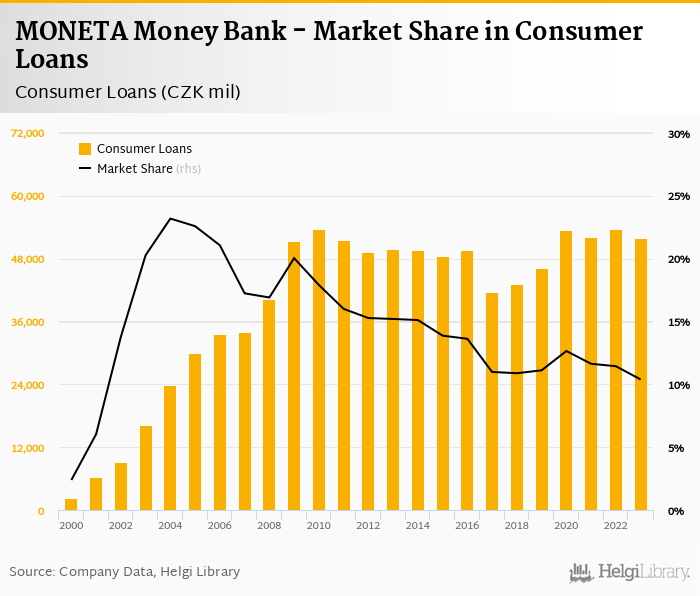 MONETA Money Bank accounted for 10.4% of all consumer loans issued in Czechia at the end of 2023. Historically, the bank’s market share in consumer loans reached an all time high of 23.2% in 2004 and an all time low of 2.39% in 2000.
