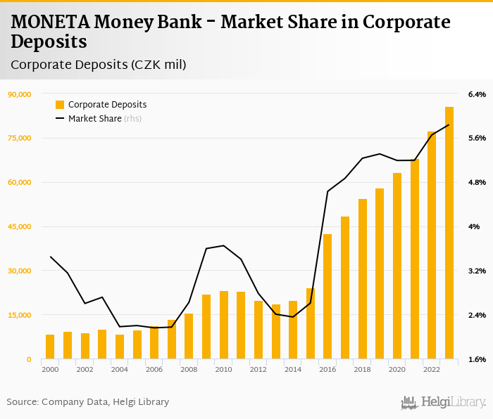 MONETA Money Bank accounted for 5.84% of all corporate deposits taken by banks in Czechia at the end of 2023. Historically, the bank’s market share in corporate deposits reached an all time high of 5.84% in 2023 and an all time low of 2.16% in 2006.