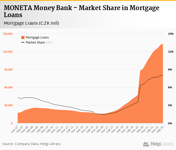 MONETA Money Bank's mortgage loans reached CZK 132,591 mil in 3Q2022, up 1.47% compared to the previous year.