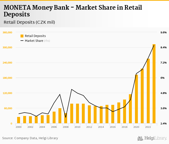 MONETA Money Bank accounted for 8.57% of all retail deposits taken by banks in Czechia at the end of 2023. Historically, the bank’s market share in retail deposits reached an all time high of 8.57% in 2023 and an all time low of 2.85% in 2008.
