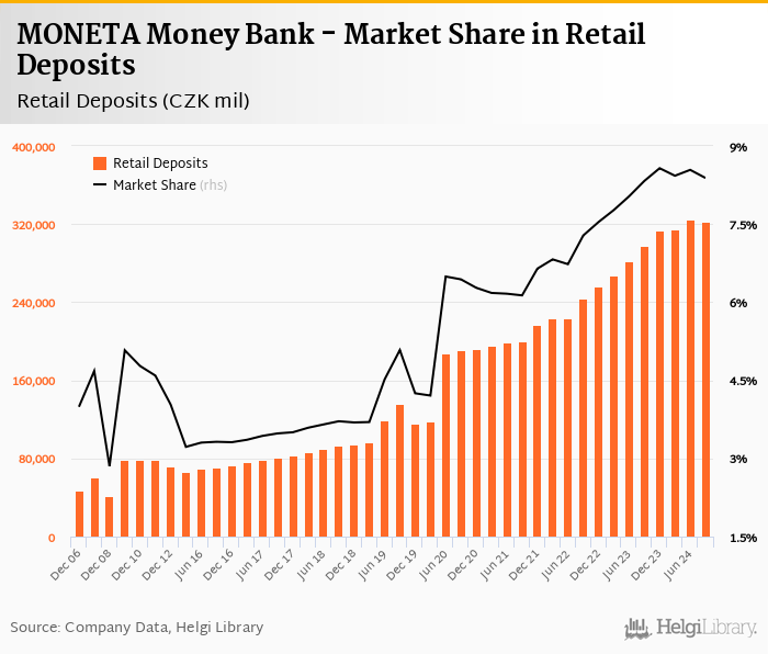 MONETA Money Bank's retail deposits reached CZK 322,458 mil in 2024-09-30, down 0.800% compared to the previous year.