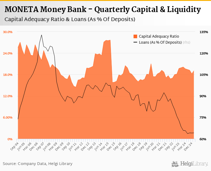 When compared to bank's main peers, Ceska Sporitelna ended the first quarter of 2025 with a capital adequacy ratio at 19.8% and loans to deposits of 70.6%, CSOB with 18.4% and 64.1% respectively and Komercni Banka some 18.7% in terms of capital adequacy and 70.6% of loans to deposits at the end of the first quarter of 2025.