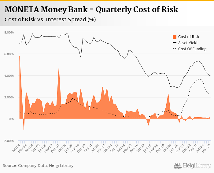 MONETA Money Bank's Cost of Risk (loan loss provisions as % of total assets) amounted to 0.121% in the first quarter of 2025, up from 0.028% when compared to the previous quarter.