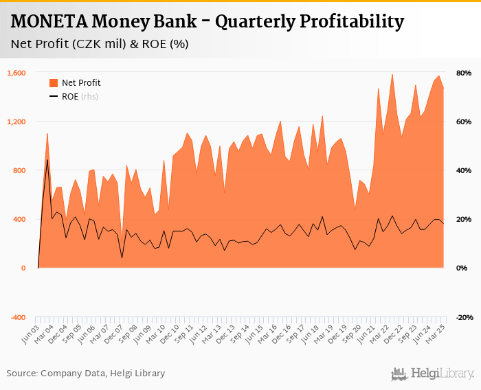 MONETA Money Bank made a net profit of CZK 1,466 mil in the first quarter of 2025, up 14% when compared to the same period of last year. This implies a return on equity of 18.0%.