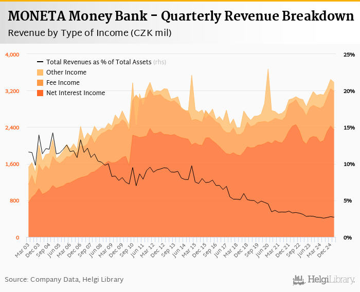 When compared to bank's main peers, Ceska Sporitelna generated total revenues of 2.76% of assets in 1Q2025 CSOB operated with 1.97% revenue margin and Komercni Banka produced total income worth 2.30% of assets.