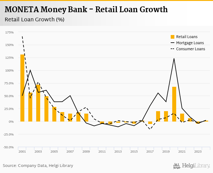MONETA Money Bank's retail loans reached CZK 183,079 mil at the end of 2024, up 1.97% compared to the previous year. In the last decade, the average annual loan growth amounted to 10.7%.