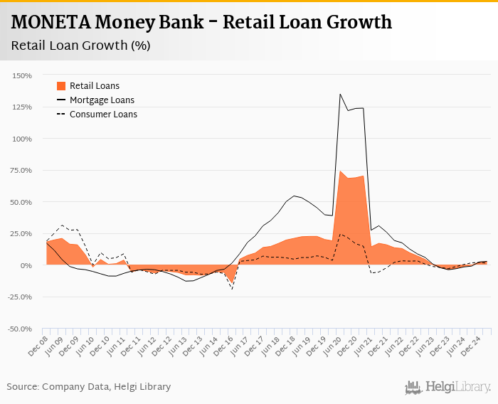 MONETA Money Bank's retail loans reached CZK 184,168 mil at the end of 2025-03-31, up 0.595% compared to the previous year. In the last decade, the average annual loan growth amounted to 0%.