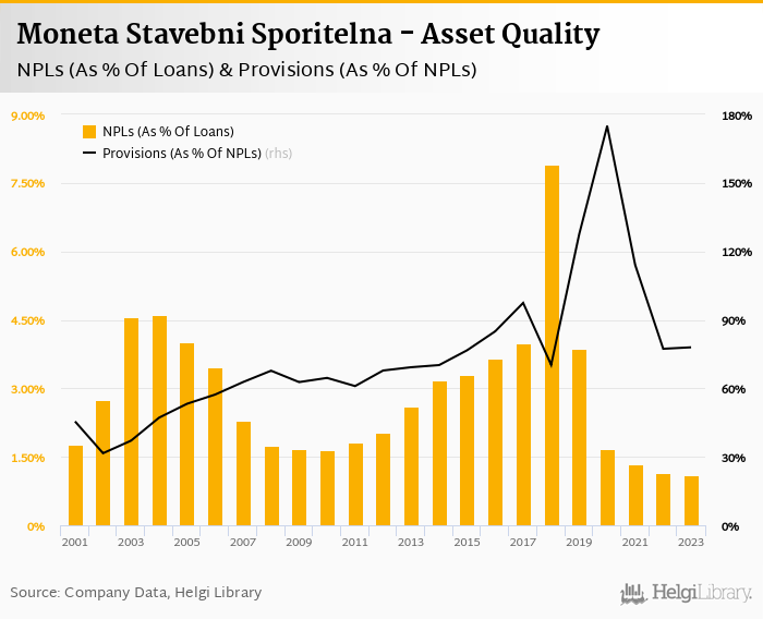Comparing Moneta Stavebni Sporitelna with its closest peers, CSOB Stavebni Sporitelna operated at the end of 2023 with NPL ratio of 1.61% and provision coverage of 80.8% and Modra Pyramida Stavebni Sporitelna with 1.12% and 53.1% respectively.