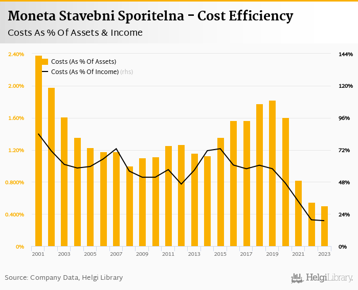 Moneta Stavebni Sporitelna's cost to income ratio reached 19.0% in 2023, down from 19.7% compared to the previous year.