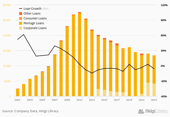 Mortgage loans represented 68.3% of the bank's loan book at the end of the year 2023, consumer further 0% and corporate loans 31.4% of total loans.