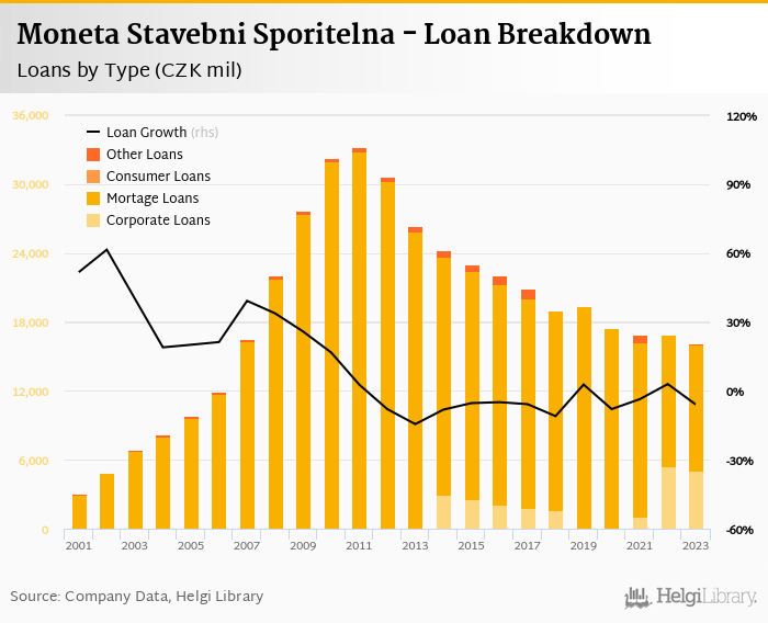 Moneta Stavebni Sporitelna's loans reached CZK 16,132 mil in the 2023, down from CZK 16,946 mil compared to the previous year. Historically, the bank’s loans reached an all time high of CZK 33,214 mil in 2011 and an all time low of CZK 3,013 mil in 2001.