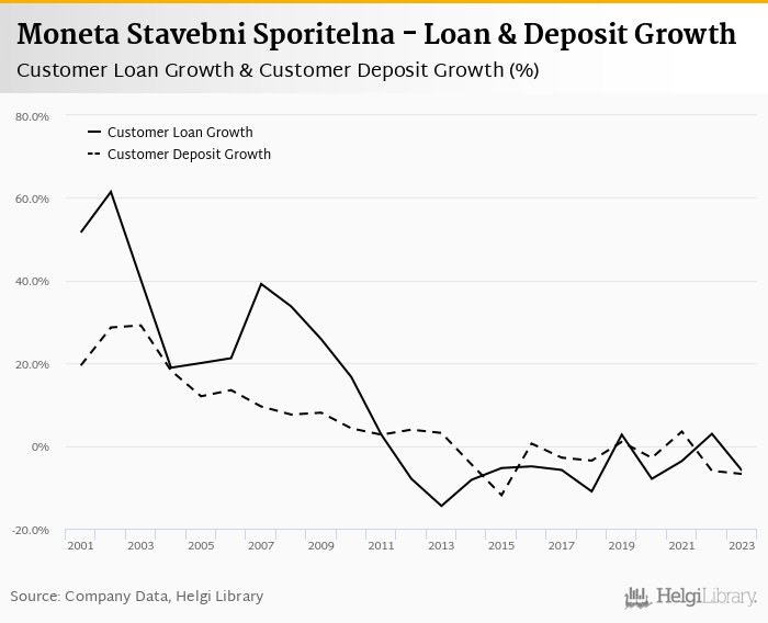 Moneta Stavebni Sporitelna's customer loan growth reached -5.95% in 2023, down from 2.94% compared to the previous year. Historically, the bank’s loans growth reached an all time high of 61.4% in 2002 and an all time low of -14.5% in 2013. In the last decade, the average annual loan growth amounted to -4.81%.