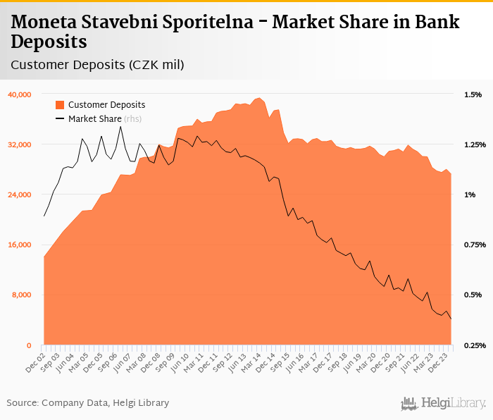 Moneta Stavebni Sporitelna's customer deposits reached CZK 27,172 mil in 2024-03-31, down 2.81% compared to the previous year.
