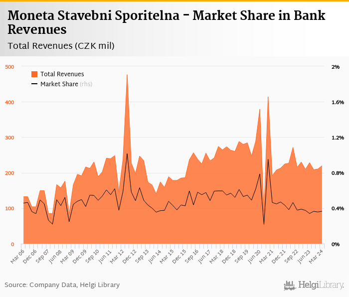 Moneta Stavebni Sporitelna generated total banking revenues of CZK 220 mil in 2024-03-31, up 4.32% compared to the previous year.