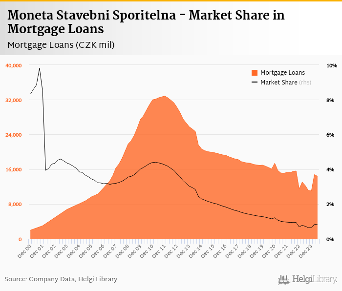 Moneta Stavebni Sporitelna accounted for 0.808% of all mortgage loans issued in Czechia at the end of 2Q2024. Historically, the bank’s market share in mortgage loans reached an all time high of 9.81% in 3Q2001 and an all time low of 0.632% in 4Q2023.