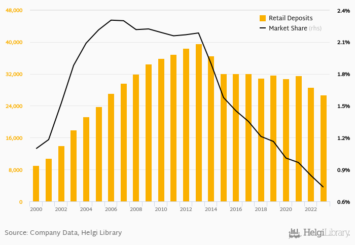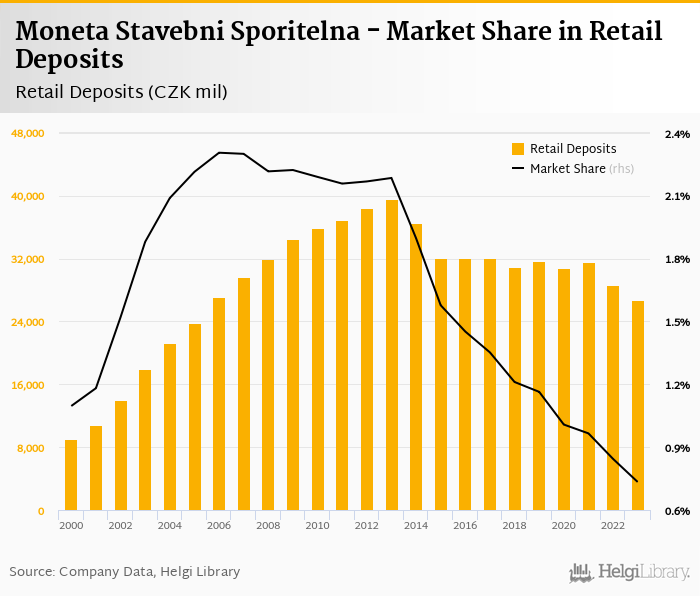 Moneta Stavebni Sporitelna accounted for 0.734% of all retail deposits taken by banks in Czechia at the end of 2023. Historically, the bank’s market share in retail deposits reached an all time high of 2.31% in 2006 and an all time low of 0.734% in 2023.