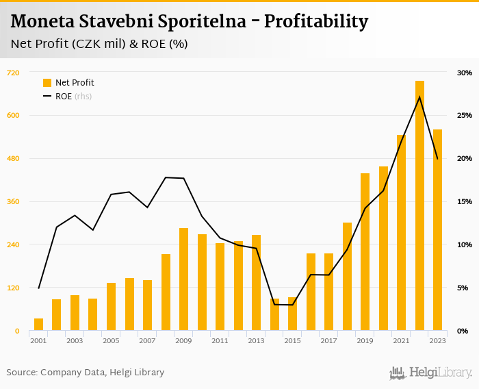 Moneta Stavebni Sporitelna made a net profit of CZK 561 mil in 2023, down 19.6% compared to the previous year. This implies a return on equity of 19.8%.