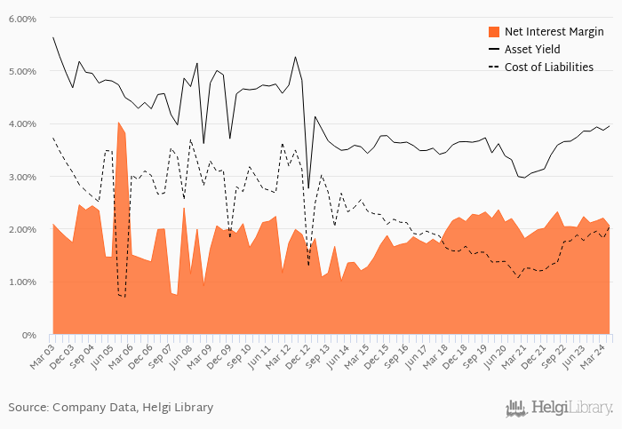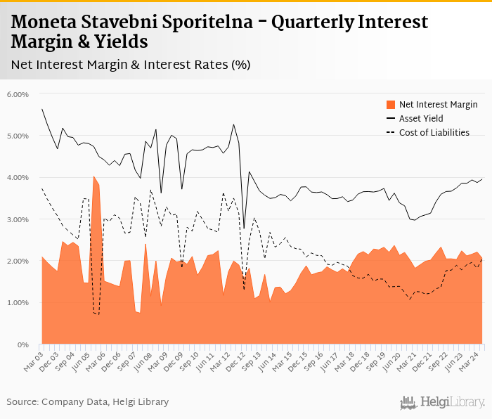 Moneta Stavebni Sporitelna's net interest margin amounted to 2.05% in the second quarter of 2024, down from 2.20% when compared to the previous quarter.