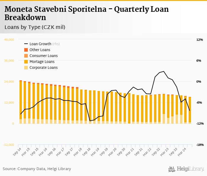 At the end of second quarter of 2024, Moneta Stavebni Sporitelna's loans accounted for 56.2% of total deposits and 52.0% of total assets.