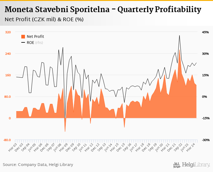 Moneta Stavebni Sporitelna made a net profit of CZK 122 mil in the second quarter of 2024, down 17.9% when compared to the same period of last year. This implies a return on equity of 23.5%.