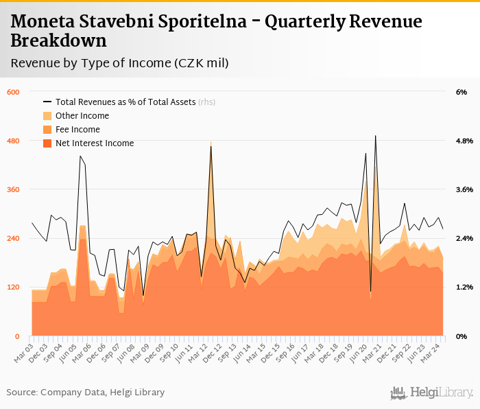 Moneta Stavebni Sporitelna generated total banking revenues of CZK 190 mil in the second quarter of 2024, down 16.8% when compared to the same period of last year and 13.5% when compared to the previous quarter.