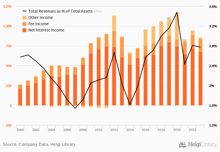 Bank's total revenues accounted for 2.77% total assets in 2023, down from 2.81% a year earlier.