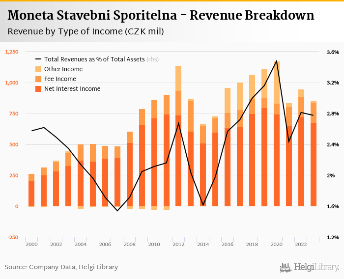 Comparing Moneta Stavebni Sporitelna with its closest peers, CSOB Stavebni Sporitelna generated total revenues of 1.82% of assets in 2023, and Modra Pyramida Stavebni Sporitelna operated with 1.26% revenue margin.