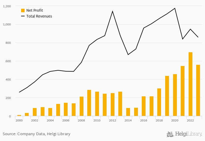 Historically, the bank’s net profit reached an all time high of CZK 698 mil in 2022 and an all time low of CZK 13.1 mil in 2000. The average profit in the last five years amounted to CZK 540 mil.