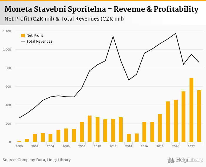 Moneta Stavebni Sporitelna made a net profit of CZK 561 mil under revenues of CZK 857 mil in 2023, up -19.6% and -9.41% respectively compared to the previous year.