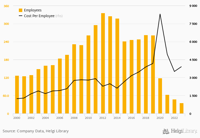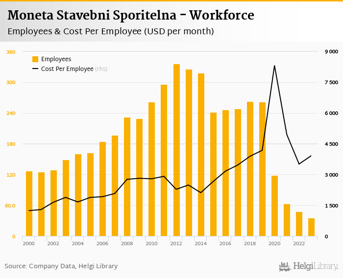 Moneta Stavebni Sporitelna employed 35.0 persons in 2023, down 27.1% when compared to the previous year. Historically, the bank's workforce hit an all time high of 336 persons in 2012 and an all time low of 35.0 in 2023.