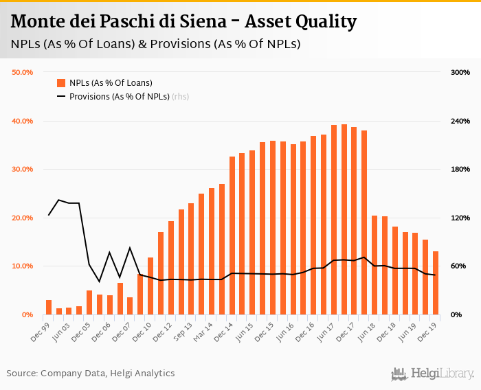 Monte dei Paschi di Siena's non-performing loans reached 13.2% of total loans at the end of 2019-12-31, down from 18.2% compared to the previous year. Historically, the NPL ratio hit an all time high of 39.3% in 2017-09-30 and an all time low of 1.45% in 2002-12-31.