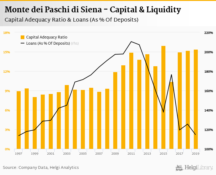 Monte dei Paschi di Siena's capital adequacy ratio reached 15.4% at the end of 2019, up from 15.2% compared to the previous year. Historically, the bank’s capital ratio hit an all time high of 16.0% in 2015 and an all time low of 8.06% in 1999.