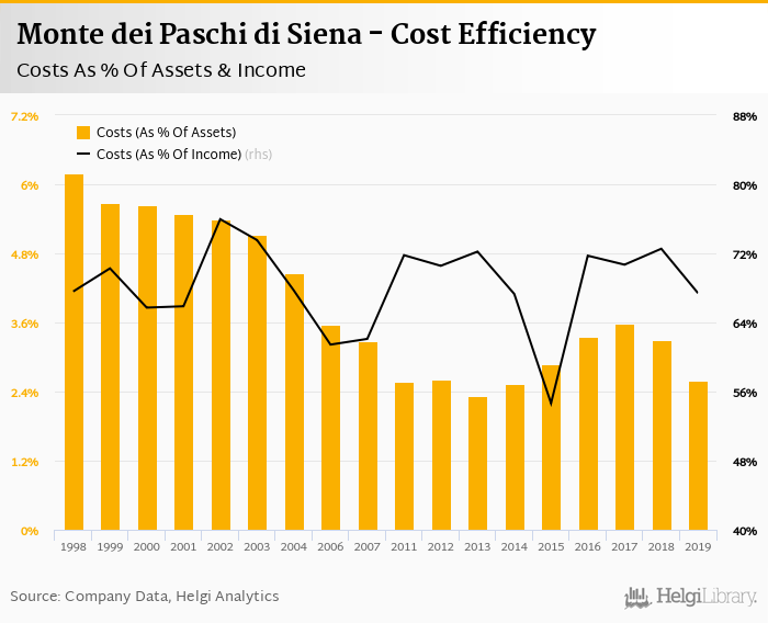 Monte dei Paschi di Siena's cost to income ratio reached 67.4% in 2019, down from 72.5% compared to the previous year.