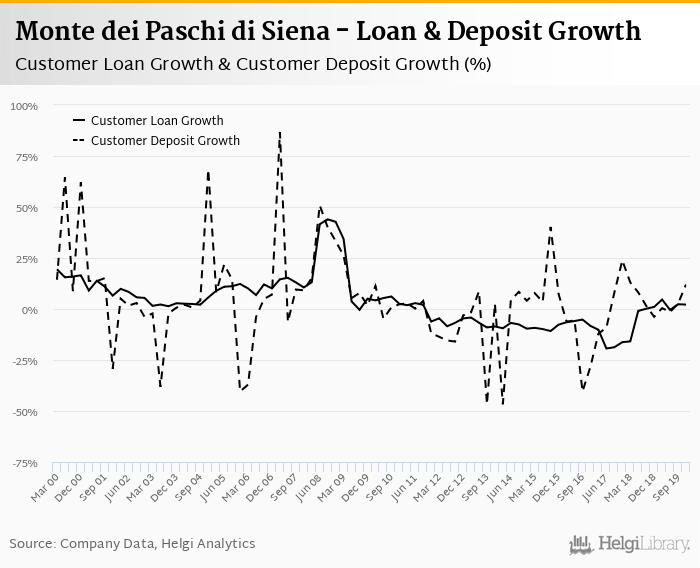 Monte dei Paschi di Siena's customer loan growth reached 2.15% in 2019-12-31, up from 1.02% compared to the previous year. Historically, the bank’s loans growth reached an all time high of 44.0% in 2008-09-30 and an all time low of -19.4% in 2017-06-30. In the last decade, the average annual loan growth amounted to -5.72%.