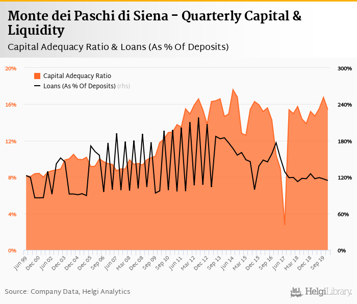 Monte dei Paschi di Siena's capital adequacy ratio reached 15.4% at the end of fourth quarter of 2019, down from 16.8% when compared to the previous quarter. Historically, the bank’s capital ratio hit an all time high of 17.6% in 2Q2014 and an all time low of 2.76% in 2Q2017.