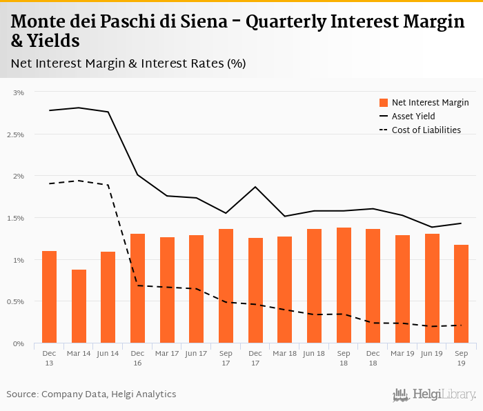 Monte dei Paschi di Siena's net interest margin amounted to 1.18% in the third quarter of 2019, down from 1.31% when compared to the previous quarter.