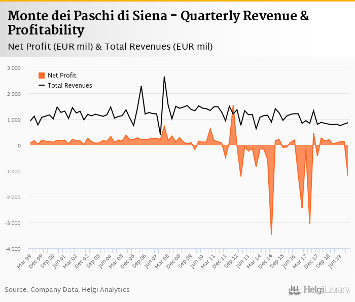 Monte dei Paschi di Siena made a net profit of EUR -1,207 mil under revenues of EUR 859 mil in the fourth quarter of 2019, down 3% and up 10.1% respectively when compared to the same period last year.