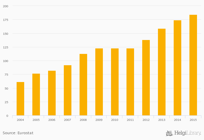 Historically, Monthly Minimum Wage (EUR) - Eurostat in Bulgaria reached an all time high of EUR 184 in 2015 and an all time low of EUR 61.4 in 2004.