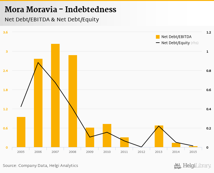 Mora Moravia's net debt stood at CZK 6.71 mil and accounted for 0.013 of equity at the end of 2015. The ratio is down 0.037 pp compared to the previous year.